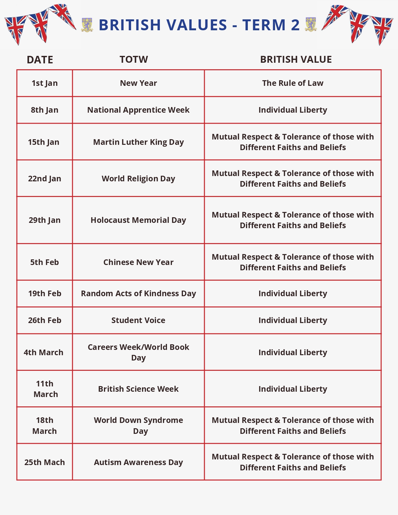 •Promote the basic British values of democracy, the rule of law, individual liberty, and mutual respect and tolerance for those of different faiths and beliefs.